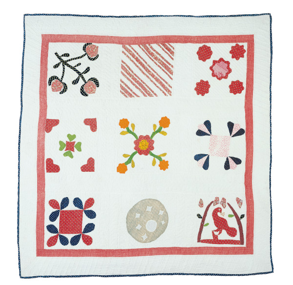 When mastered, appliqué allows for much more experimentation than piecing. The appliqué bird on a swing in this Album Crib Quilt may have originated as a child's drawing or a tracing of a wallpaper design. With the necessary design components cut from the proper colored cloth, the quilter could assemble the design, baste it to the cloth, and anchor it with little stitches to the background cloth.