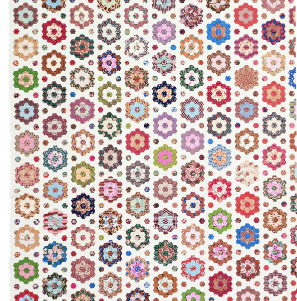 Mosaic quilts enabled quiltmakers to demonstrate their needlework skills. In this Hexagon Mosaic Quilt , the finished hexagons are only 5/8 inch on a side, and the basting stitches are visible. The paper templates used are so small that they disappear among the folded cloth edges.