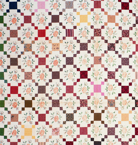 This Nine Patch Quilt echoes the mid-nineteenth-century preference for regularity and order in garden and textile design, but the unknown American maker who stitched it has introduced innovation with the stenciled pattern in the center of each nine-patch repeat. Nine-patch quilt blocks initially contain nine equal squares, arranged three rows across and three down. A simple repeat will have just nine squares, but a more complex arrangement such as this quilt will further break down the squares to create a more complex overall design. There are several elements in this example that elevate the craftsmanship beyond a basic nine-patch quilt: the multi-colored fabric squares were appliquéd onto a simple white background; the full-blown rose with leaf and bud adornments were stenciled into the center; and then the layers were quilted together with intricate stitching. The beautiful full-blown red roses may symbolize beauty, love, and the comforts of home.