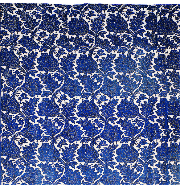 Indigo resist prints were created by applying paste to specific areas of a white cloth prior to an indigo dye bath. The blue indigo color was blocked from the areas masked with paste, leaving a design on the cloth. Indigo resist prints are among the rarest textiles. Examples that most closely resemble these coverlets are found only in the United States.