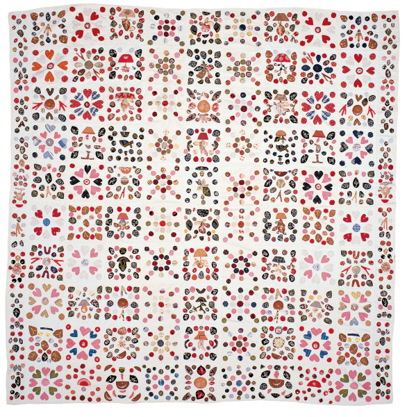 n this Appliqué Quilt, the maker has positioned an anchor, bird, or horseshoe at the center of each appliqué block. Known as "conversation" prints, these images were popular in the 1880s and 1890s. Other popular motifs were baseball bats, riding whips, sailboats, and bicycles.