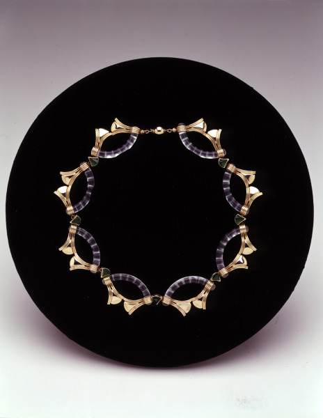 Lotus Necklace #3 is one of two necklaces by Linda MacNeil in Tthe Mint Museum’s collection that depict lotus flowers in a style reminiscent of ancient Egyptian art. The other, Nile Midnight, is on view in the Craft + Design permanent collection gallery of jewelry. On both necklaces, the lotus emerges from a V-shaped plant and is abstracted into geometric elements. MacNeil says of these two works, “The lotus is such an exotic plant. I am attracted to the contrast of its powerful color, with a flower like a gem on display above the brilliant green lily pad.” She was inspired to create her own version of the lotus after seeing it represented in Egyptian art. MacNeil has been making jewelry with glass elements since the late 1970s. She made Lotus Necklace #3 at the Waterford Crystal factory in Ireland, following a residency there held by her husband, glass artist Dan Dailey. (Allure of Flowers)