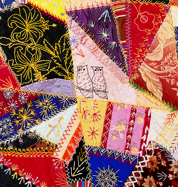 Regular patchwork quilts combine pieces of fabric into an organized and predetermined pattern, but crazy quilts use irregular pieces (often leftover from furnishing textiles and clothing) to form haphazard-looking and asymmetrical designs. This work was made during the peak of the crazy-quilt popularity, 1880-1920. The fabric scraps were laid out onto a plain ground, then hand-embroidered with heavily-embellished stitches. In comparison to other quilts in this exhibition, this crazy quilt incorporates differently-textured pieces of fabric and more elaborate embroidery as the careful geometric design is much less important. Although most quilts in the late nineteenth and early twentieth centuries were thought to maintain a family’s morality by filling the home with inherently beautiful objects, this well-made crazy quilt is much more than just a utilitarian object. Several fabric scraps are embellished with large, distinctive trumpet lilies. These are robust, fragrant cultivars that are prized in the garden for their graceful stature and wonderful variety. (Allure of Flowers) At first glance, crazy quilts appear chaotic and lacking a well executed plan. On closer examination, it becomes clear that they are quite the opposite. This Victorian Crazy Quilt uses the diamond as its foundation block. Each diamond block was covered with a dozen or so pieces, and each block was then embellished with fancy stitches to cover the seam lines and depict pictorial images in the open spaces. Fans, interlocking circles, owls, butterflies, trumpet lilies, and ducks are among the motifs typically used in crazy quilts. (Bresler Exhibition)