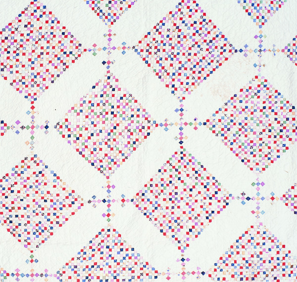 The anonymous maker of this Postage Stamp Quilt was clearly talented and patient. This quilt is composed of thousands of tiny 1 inch by 1 inch squares of the brightly colored and pastel prints available in America in the 1930s. In addition, the quilter used the negative space on the quilt to create a white diagonal grid that seems to float in front of a pieced background.