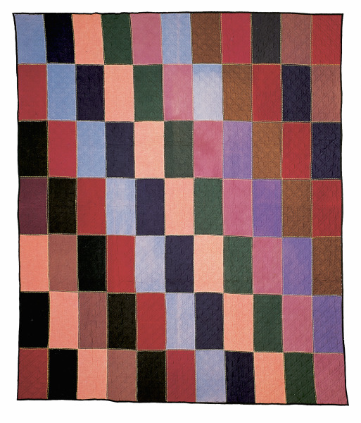 This Bricks Quilt is also attributed to the Amish of Lancaster, Pennsylvania. It is similar to utilitarian quilts made from wool suiting swatches. This otherwise humble and presumably utilitarian quilt was meticulously constructed and well designed.