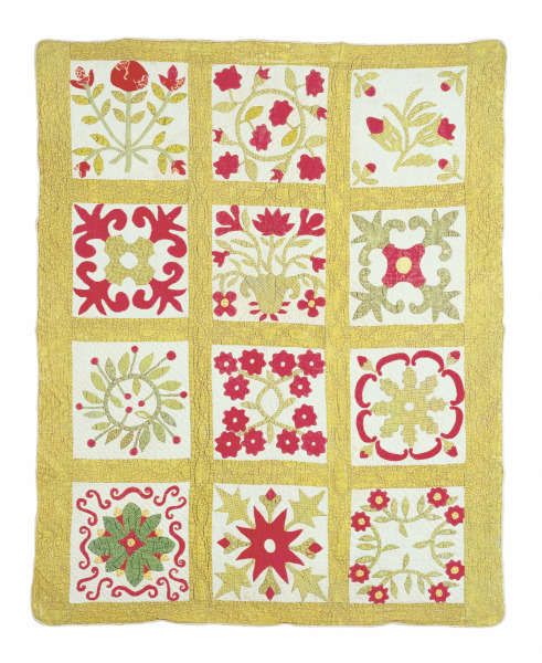 The twelve botanical appliqué blocks in red, green and yellow are typical of appliqué album blocks from the mid-1800s. Although this quilt is an album of blocks, it contains no inscriptions pertaining to dates or locations. It may, in fact, be a sampler of blocks compiled by the quilter for her own keeping.