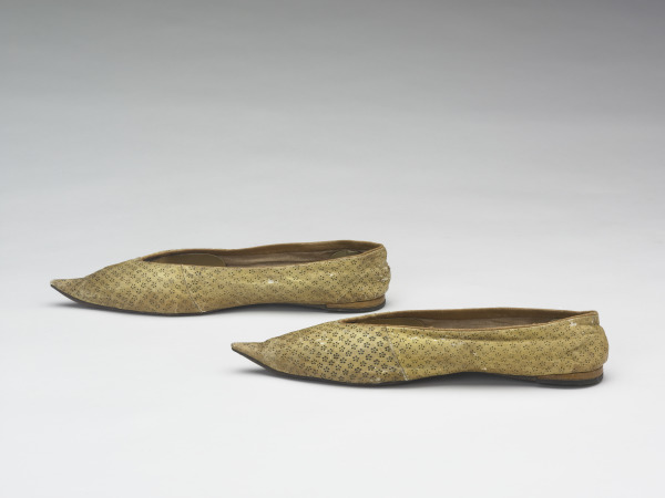 Roller-printing offered a new, inexpensive way to apply color and pattern to leather when it was developed in the 1780s, offering a means of decoration that worked with the simple shape of slip-on shoes then popular. The pointed toes reflect the fashion for “Orientalism” in art of the time; though intended to look Chinese, they actually resemble Near Eastern shoes.