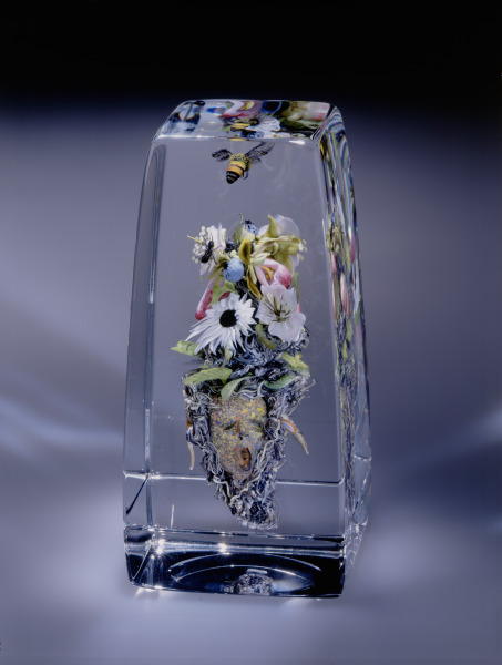 Paul Stankard’s meticulously crafted sculptural paperweight is more than simply a floral arrangement captured in glass; like many of his works, it explores the dual forces of growth and decay, life and death, present in all nature. Comprising Carolina Bouquet Botanical are plants and flowers native to the Carolinas, including mountain laurel, lady’s slipper, and a blueberry. Hovering above them is a honeybee, alluding to its important role in pollinating flowers. Continuing this holistic approach to the interconnectedness of nature, Stankard also depicts the plants’ root system, populated by two elements of magical realism. One of his signature “root people” is seen from behind, representing the benevolent energy underlying all of life. On the opposite side is a mask wearing a fearful expression, made in response to the death of a friend around the time that Stankard made this work. (Allure of Flowers)
