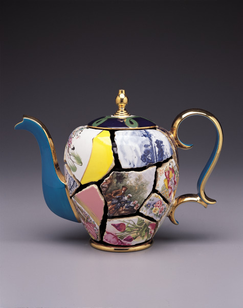 Richard Milette’s purely sculptural Teapot includes vignettes of roses and other flowers among the shards of decorated ceramics that surround its central form. Several of the vignettes depict men and women courting in outdoor settings; roses contribute to an overall mood of romance, sentimentality and femininity. The Teapot’s shape, subject matter, and expanses of vivid blue and pink reference Sèvres porcelain produced exclusively for royal and aristocratic use before the French Revolution in 1789. On the teapot and related works by Milette, these references connote the decadence, theatricality, and elitism of both art and society under France’s ancien régime. (Allure of Flowers)