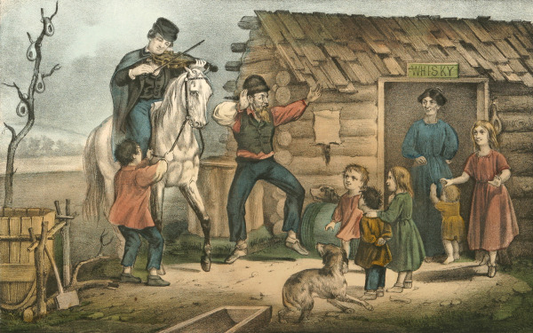 In 1857 the business partnership of Nathaniel Currier and James Merritt Ives, located in the heart of "newspaper row" in New York City, initiated a printing legacy. Their inexpensive color lithographs depicted all aspects of 19th century America, from newsworthy events to leisure activities. Over a period of nearly seventy years, the firm sold over ten million prints of more than seven thousand titles. These two prints were inspired by the popular melody, The Arkansas Traveller that appeared around 1858-1863, relating a suspect encounter between a backwoods Arkansas fiddler and a sophisticated city-gentleman. They portray the "before-and-after" of the backwoodsman's distrust of the stranger until he proves himself by expertly playing the fiddle. Just as with the prints, the fireplace surround, made of individually molded tiles from the Moravian Pottery and Tile Works, illustrates scenes from The Arkansas Traveller and documents Henry C. Mercer's use of songs and legends for subject matter.