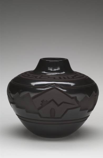 Landscape and natural forces are implied by the carved areas on this jar, creating a pictorial field that recedes from the high gloss surface.