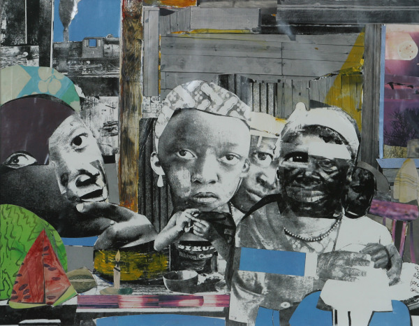 “I use the train as a symbol of the other civilization—the white civilization, and its encroachment on the lives of the blacks. The train was always something that could take you away.” Romare Bearden In this small but dynamic collage, Romare Bearden depicts a family gathered together at a table inside a humble wooden dwelling. Each element of the composition – from the faces and bodies of the figures (the one on the right holding a small child, and all gazing outward at the viewer) to the food that they eat to the structure of the home itself – is pieced together from a range of disparate elements that have been brought together to create a dynamic whole. In the window on the upper left hand side of the composition the train steams by. The Train is, in fact, directly related to an even earlier Photostat collage titled Mysteries, created in the 1960s. The artist has re-used many of the elements from this collage but incorporated them into a more colorful composition.