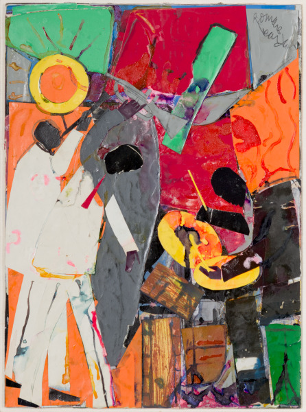 Drum Chorus reveals just how wide a range Bearden had when it came to depicting the power of music. While a work like Evening Guitar, hanging nearby and completed just a year earlier, suggests a hushed, calm environment, Drum Chorus is bursting with energy. Here, Bearden used jagged, brightly colored strips of paper in the background, painted lines representing sound bursting forth, and angular figures in active poses to suggest the energy and action of the scene, where the drummer (on the right hand side of the composition) takes over and leads the song.