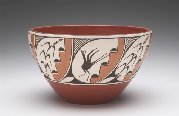 Zia pottery designs are symbolic messages that pertain to the function of the vessel they decorate. Here, roadrunners, the bearers of prayers, and maize plants adorn this large bowl used to prepare maize or wheat dough for bread.