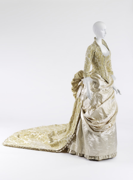 This wedding gown belonged to Alice Faye Otis, the daughter of prominent Bostonians. In 1884 she wed Dr. Walter Otis, a wealthy Boston psychiatrist. Although the exact date of their wedding is not known, the heavy fabric of the gown suggests a fall or winter ceremony. Known to dress in expensive garments, Mrs. Otis must have made quite an impression walking down the aisle in this sumptuous gown - a couture creation from L. P. Hollander & Company of Boston, Newport and Paris. Featuring the classic bustle silhouette of the Gilded Age, the dress boasts a 100-1/2 inch train lined underneath with row after row of French lace that would not even be seen unless the train was lifted to reveal this extravagance.