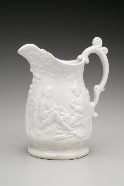 These two pitchers, one English, the other made in America, illustrate the influences that English potters had on the fledgling pottery business in America. Staffordshire potters came to America as mold makers, glazers, potters, and technicians. They brought the English potting traditions with them, and often brought their molds as well.