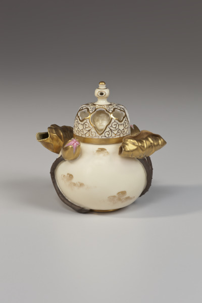 This lovely potpourri jar is in three parts: body, reticulated lid, and inner cover with a putti head for a knob. Belleek is a very thin porcelaneous body that allows for extremely delicate working.
