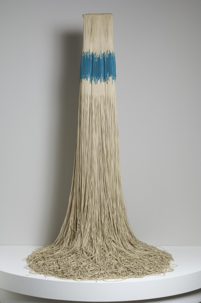 Claire Zeisler was a pioneer of the Fiber Art movement. She began her career making weavings on a traditional loom. Frustrated by the confines of the technique, Zeisler began making innovative wall hangings and later free-standing three-dimensional fiber sculptures. Her explorations pushed the medium in new directions and helped to create the field now known as fiber art. Blue Vision is part of a body of work that has a waterfall-like appearance. Built on a steel armature, the woven and coiled hemp strands cascade to the floor.