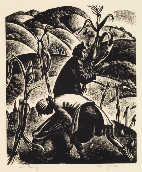 Thomas Hart Benton, Grant Wood, and Clare Leighton all worked in a lyrical, figurative style during the middle of the Twentieth Century in order to depict various aspects of life in rural America. Here, their topics range from a proud farmer and a working ploughman to figures harvesting tobacco and corn. Whereas John Biggers, whose powerful drawing hangs nearby, highlighted the difficulties of such labor, these artists make it appear harmonious and pastoral.