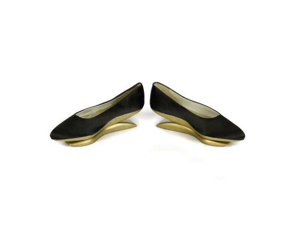 Named for a style of Japanese theater, the “Kabuki” shoe is inspired by traditional Japanese wooden platform shoes. This aerodynamic design purportedly gave the illusion of walking on air, especially with the versions that featured black lacquered wood platforms, prompting Beth Levine’s later observation, “I should have called them ‘airplane’ pumps.” Such novel designs were typical of Beth and Herbert Levine’s footwear from the 1960s through the 1980s.