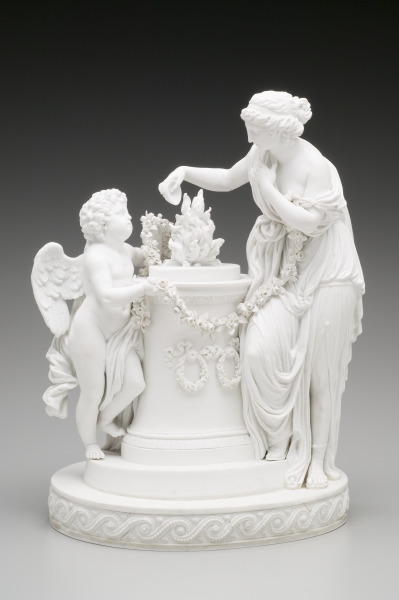 This figural group depicts Venus making an offering on the altar before Cupid. It is in the neoclassical style which was inspired by recent discoveries made at Herculaneum and Pompeii. It is of biscuit porcelain, meaning porcelain that has been fired to maturity but not glazed.