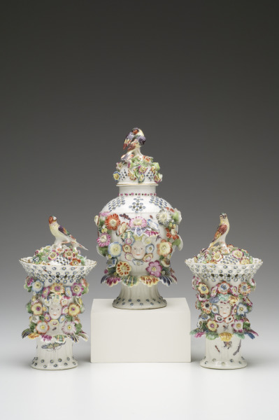 These vases are often called “frill” vases, because of the frill, or projecting trim, of shell-shaped leaves that encircle the lower section of each vase and form canopies over each vase’s female masks. Derby specialized in these potpourri frill vases, but complete garnitures, or sets, are rare today.