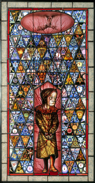 Judith Schaechter’s stained glass art work combines innovative variations of ancient techniques with contemporary themes of death, sex, violence and romance. Typically her narratives are brought to life by a cartoon-like female figure. In Hemophilia, a wide-eyed girl is centrally positioned with blood trickling from her veins. This imagery stimulates a variety of emotional responses. Audiences might be disturbed or perhaps feel a sense of reverence. The work’s title Hemophilia references a rare genetic disorder that prevents an individual’s blood from clotting.
