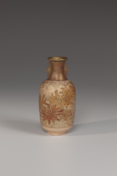 Chrysanthemums adorn this vase hand-painted by Mary Louise McLaughlin in a harmonious union of style and subject matter. Members of the Aster family, the flowers are native to Asia and northeastern Europe and feature in Chinese art as a symbol of autumn. McLaughlin’s composition of chrysanthemums and the shape of the pre-existing vase that she chose to decorate are Chinese in style, and the palette of gold, orange and red is appropriately autumnal. McLaughlin was inspired by the Asian art she saw at the Centennial Exposition in Philadelphia in 1876, which remained a wellspring throughout her career. (Allure of Flowers) China painting was popular in Cincinnati, and Louise McLaughlin played a pivotal role in its introduction and development there. She continued to paint on objects even after she worked in porcelain. (ACS Exhibition)