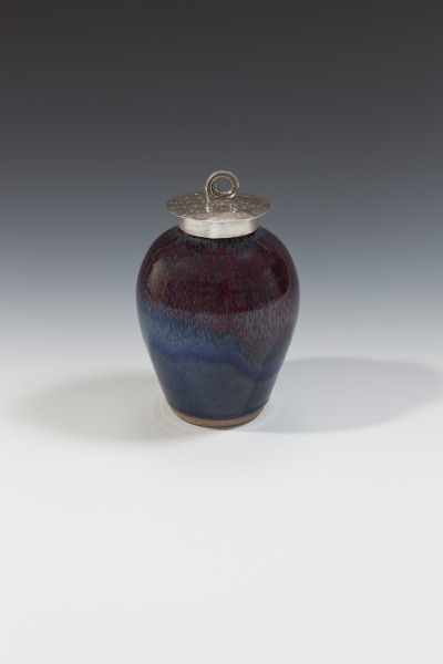 Pamela Owens came to work at Jugtown Pottery, near Seagrove, initially as an apprentice. She eventually married Vernon Owens, Jugtown’s owner, and together they now run and operate this historic pottery. This small jar illustrates Pam’s interest in complementing form with color. The silver lid is by her sister, Jennifer Lorette.