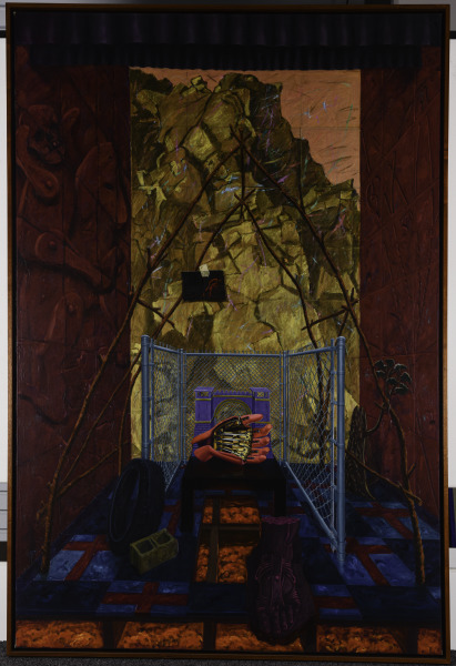 The brilliant Gate of Heaven is a kind of summation of Bireline's approaches to his art and the world. Everything in the painting is part of a stage set, announced by the curtain above and the two wings leading to the gilt mountain beyond. In this theater of the mind nothing lasts: art, represented by the stone foot removed from whatever statue lay above it, is not eternal; the tire and the cinderblock are castoffs, the detritus of our civilization. The red crosses may suggest our efforts to find something lasting in religion. The crosses, on tiles that cover only a portion of the stage floor, lie above an image that Bireline uses more than once-the inescapable and all-consuming flames of time. Within the stage set, we appear to be trapped atop the fire. A three-sided steel mesh fence and a cyborg hand bar the way to a small city gate that opens onto the craggy golden peak and pink sky beyond, a scene that is made to look like it has been painted on a stage flat. Max Halpern, George Bireline, The Many Roads Taken (Greenville, NC: Greenville Museum of Art, 2004) pp. 22-24.