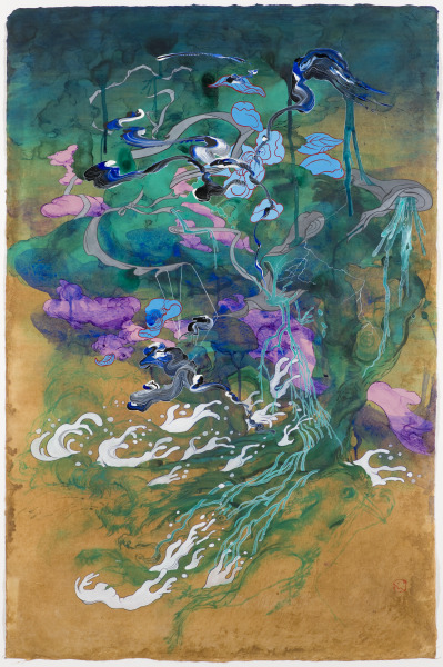 Referencing many traditions simultaneously, including traditional Asian landscape painting, cartography, calligraphy, and the appropriation of icons from popular culture, Jiha Moon brings a unique cross-cultural perspective to her work. Moon uses the genre of landscape as a point of departure. However, she is not interested in creating realistic representations of traditional pastoral scenes. Instead, she often evokes atmospheric conditions such as gusts of wind, rain, and clouds. Through the combination of lyrical painted and drawn elements, gestural washes and flowing brushstrokes, Moon conveys elements of the natural world. In the case of "Jade Cycle," this element is water. Moon illustrates the journey of precipitation as raindrops form larger bodies of water such as rivers and streams transform into vapor. This kind of layering of marks and brushstrokes involves a distinctive combination of abstract and representational styles. Moon has stated, “I am a cartographer of cultures and an icon maker in my lucid worlds. I want to be a visual interpreter of the mixed cultural worlds of my generation.”