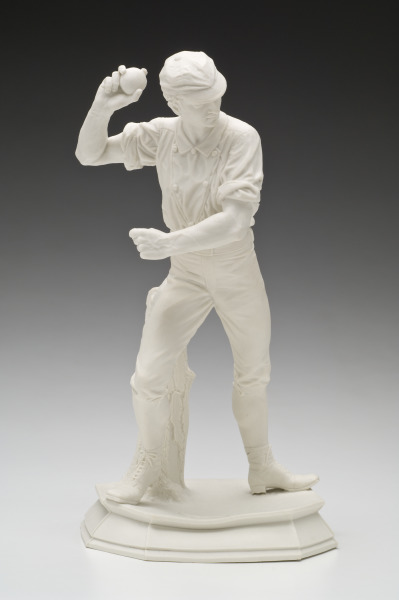 Ott and Brewer hired the sculptor Isaac Broome to create a prototypically American work for the firm to display at the Philadelphia Centennial Exhibition in 1876. Broome devised a monumental vase to honor America’s favorite pastime, complete with three baseball player figures around its base. The factory then made copies of these sculptures, including the “Pitcher,” for individual sale.