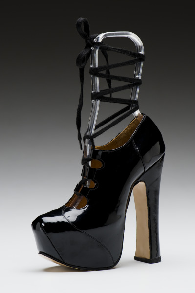 Westwood ranks among the top British designers with her influential and inventive fashions. In 1993, Westwood’s extreme “Gillie” platform shoes (from which this model is derived) created headlines when top fashion model Naomi Campbell fell on the fashion runway while wearing a pair of Westwood shoes with four-inch platform soles and eight-inch heels.