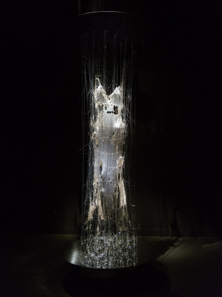 New York based artist E.V. Day has become known for her gravity defying installations that address themes of sexual and social stereotypes. "Transporter" is a piece from her series ‘Exploding Couture.’ Using an elaborate system of monofilament, Day recreates the moment at which a designer ballgown begins to explode into thousands of tiny pieces. The ballgown’s shimmer is retained and its original stylish form is recognizable, but it is presented at the moment just before it shatters into abstraction. “It’s not a piece about someone violently destroying a dress,” explains Day, “but rather something orgasmic – a celebratory expansion of energy.”