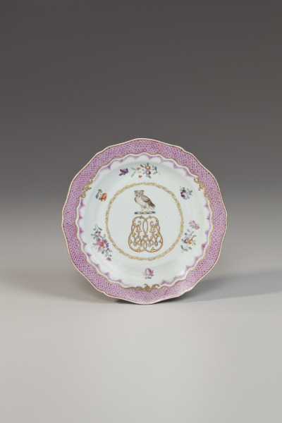 This plate is decorated with an owl, the armorial crest of Woodley, and beneath it the initials “W. W.” The service was made for William Woodley (1728–1793), who served two periods as Governor of the Leeward Islands, a British colony in the Caribbean.