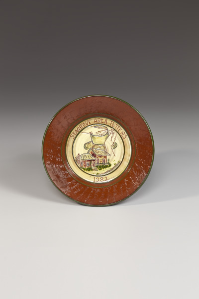 Dorothy Cole Auman, an eighth-generation potter, and her husband Walter, also a potter with roots in the Seagrove tradition, began their collection with a great interest in preserving the rich history of North Carolina ceramics. Dorothy’s research, archeological excavations, and accumulation of pottery details the region’s history from its eighteenth-century origins with German and English immigrant pottery, to the development of a functional ceramic industry in the nineteenth century, and the emergence of an art pottery tradition in the twentieth. Dorothy made this plate to commemorate the first annual Seagrove Potters Festival in 1982. In the center of the plate is an image of Dorothy’s pottery shop crowned by a detail of Dorothy’s hands throwing a piece on her wheel. The plate’s border lists the names of potters working in Seagrove at the time.