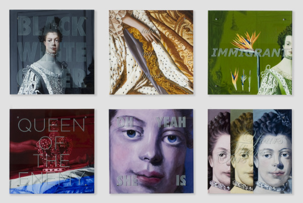 “Using the history of art as my playground, I toy with paintings from the past, and I connect them to the present,” says Ken Aptekar. His Charlotte’s Charlotte references Mint Museum Randolph’s 1772 coronation portrait of Queen Charlotte by Allan Ramsay. By appropriating Ramsay’s imagery and adding his own original text on sandblasted panels that hover above the surface of repainted details excerpted from the original painting, Aptekar initiates a dialogue between his work, Ramsay’s painting, and the viewer. The six panels of Charlotte’s Charlotte not only refer to the imagery present in the original, but also the spatial dimensions of the portrait itself: the six panels together equal the size of the historical work. Prior to creating Charlotte’s Charlotte, Aptekar met with diverse groups within the community to gain a better understanding of what Queen Charlotte means to Charlotteans. Words and phrases such as BLACK WHITE OTHER and IMMIGRANT reflect the distinct voices of the Charlotte community and function as a means of eliciting a variety of interpretations. With these texts overlaying the paintings, Aptekar intentionally addresses the issue of Queen Charlotte’s race (she was of North African, Portuguese and German descent) and invites us to compare the implications of ethnic identity at the time of Ramsay’s portrait, and the multiplicity of meanings that this may hold for contemporary viewers. The panel entitled take my hand references the Queen’s young age (17) at the time of her coronation. Just a few years later, the British Empire would be at war with the American Colonies.
