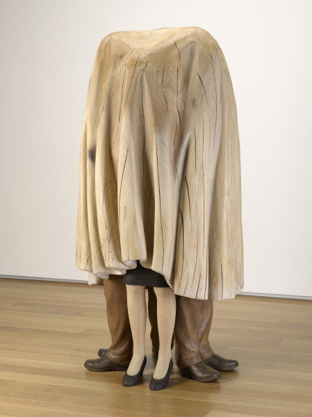 Combining wood’s visual warmth and frankness with a startling sense of isolation, Bob Trotman conveys a variety of narratives about the masks and personas that are taken on when working within a competitive organization. Cover Up was inspired by a scene from Sergei Eisenstein’s iconic 1925 film The Battleship Potemkin, in which mutinous crew members are shrouded by a tarpaulin before facing a firing squad. As in Eisenstein’s film, the shrouded figures of Cover Up could represent sacrificial victims, those scapegoated to serve as a ritualistic purging of collective wrongdoing. The diminutive scale of the figures could signify the shame or denial of what secret thing has transpired and must remain hidden, or imply something adolescent and underdeveloped—children dressed in business attire playing a collective game of hide–and–seek.