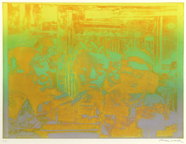 In this print version of the collage The Train, Bearden continues to play with the reversal of the original’s light and dark tones. Here, however, yellows and oranges replace the darker shades, and greens replace the lighter ones. The result, largely absent of black and white to help outline the work’s primary forms, is almost abstract: a glowing image of vibrant colors. Even the namesake train is difficult to decipher, rendered virtually invisible by the extreme intensity of the green and orange hues.
