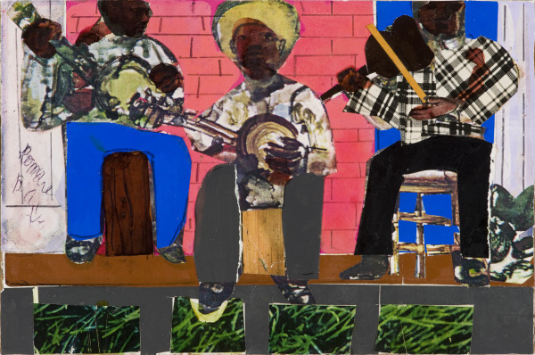 Back Porch Serenade features a recurrent theme in Bearden’s art: music, and, in particular, a trio of musicians. Here, blocks of green and black paper give the porch a sense of structure. Snippets of patterned paper create the men’s shirts. With simple means, Bearden has created a complex space that hovers between depth (the porch upon which the musicians sit) and flatness, as there is no sense of traditional perspective.