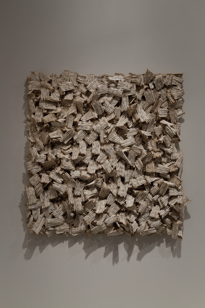 One of the pioneers of the European fiber art movement is Ritzi Gavrila Jacobi. From the expressionist tapestries with inserted thick long cables she designed with her ex-husband Peter Jacobi in the late 1960s and 1970s, and wove herself, to the fiber constructions she has made since the 1980s, the artist has consistently manipulated natural fibers to create dynamic and tactile fiber sculptures. In this example, the wrapped bundles form a bas relief suggesting a rugged terrain.