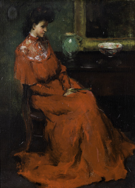 Charles Webster Hawthorne was an important early twentieth century American artist best known for his skillfully-rendered portraits and his role as an inspirational instructor. He studied in New York at the National Academy and the Art Students League; his instructors included William Merritt Chase and Henry Siddons Mowbray. In 1899 Hawthorne established the Cape Cod School of Art in Provincetown and was also a founding member of the Provincetown Art Association. One of his students, the American painter Edwin Dickinson, recalled that Hawthorne was “The best teacher I ever knew; better than Chase, who was ... very good.” The elegant "Girl in Red" is representative of Hawthorne’s early, Chase-influenced work, which he produced before moving to a more broadly-painted style later in his career, where the figures (often the local Cape Cod fisherfolk) were frequently presented frontally rather than in profile. The painting’s finely-crafted period frame was made by the Carrig-Rohane company of Boston. Its elegant style complements that of the woman’s dress and the luxurious interior in which she is seated.