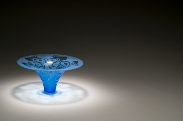 Turn this bowl upside down and it takes the configuration of a Northwest Coast Native American hat. Shaped like truncated cones, the hats were woven from spruce roots and painted with crest designs. Singletary pays homage to this tradition by sculpting the hat in glass. He contrasts transparent and opaque areas to create a symmetrical surface design in the historic style. Artist: "Based on a hat originally made from cedar bark or spruce root. Designs were usually painted on. The way it's displayed in inverted."