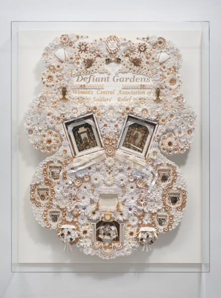 Inspired by the concept of war gardens, a grassroots effort begun during World War I to support the war effort, Dario Robleto’s Defiant Gardens represents an expression of hope. Physically, the work echoes the shape of wreaths that were placed on soldiers’ graves by Civil War women’s auxiliaries. Through an innovative combination of form and materials, Robleto has forged a poignant narrative of the wartime experience, creating an artifact that speaks to the endurance and strength of the human spirit. The artist’s labor–intensive process begins with a symbiotic union of language and material. The deliberate listing of media that make up Defiant Gardens reads as much like lines of poetry as the contents of a caption and a key component of the work itself. Robleto composes the list of media prior to the creation of the work, letting the materials dictate its form and content. He began Defiant Gardens with the knowledge that he would use such visceral and loaded materials as the skeletons of carrier pigeons and paper made from the pulp of soldier’s letters home, objects already imbued with life and memory. This reversal of process makes the materials and objects used the end, rather than the means of the work of art.