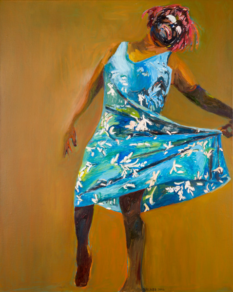 In "Dora’s Dance," Beverly McIver uses highly personal symbolism to present a complex and multilayered subject. Growing up in Greensboro, N.C. during the 1960s, McIver’s upbringing was steeped in the Civil Rights Movement; its impact on the country, and the South in particular, left a lasting impression on her. Attending a predominately white high school, McIver felt extreme economic and racial disparity between herself and her classmates. During her teens, she joined a clown club at school, where she trained as a clown and painted herself in “whiteface.” Assuming this disguise, she felt a freedom in her identity and a mobility she lacked when not in costume. In the club, she was only allowed to be a whiteface clown, so when she later discovered she could paint herself “in blackface” it was a liberating gesture, one that affirmed, instead of hid, her African-American identity. The “Dora” character was inspired by an elderly woman McIver met at a Mississippi nursing home who had spent her life in the South working as a housemaid. Although Dora desperately wanted to leave the nursing home, she was never able to. Dora’s carefree sway and joyful expression represents the hope for a personal liberation similar to Beverly’s own liberation through her self-styled creativity. "Dora’s Dance" is thus an expression of affirmation and freedom.