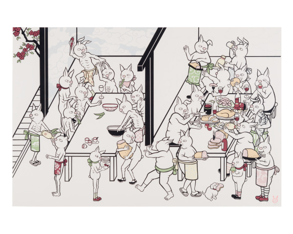 Asuka Ohsawa was born in Los Angeles, raised in Japan, and received a Master’s in Fine Arts from the School of the Museum of Fine Arts, Boston. She is currently an assistant professor in the printmaking department at San Francisco Art Institute. Her prints and paintings are usually collages of illustrations and photographs. Have and Have Nots is an example of her more narrative work, drawing upon compositional and stylistic traditions from Japanese prints but substituting animals for people.