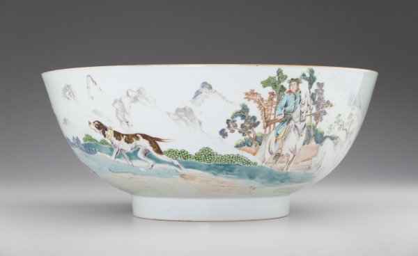 This finely painted punchbowl was surely made for an affluent English patron. Its scene derives from The Pointers and Hare, a print first published in 1754 by Thomas Burford (English, circa 1710–1774) after a painting by James Seymour (English, 1702–1752). The bowl itself was made in Jingdezhen in southcentral China, but it was decorated in an enameling workshop in the port city of Canton (modern-day Guangzhou) that handled special orders for the foreign market.