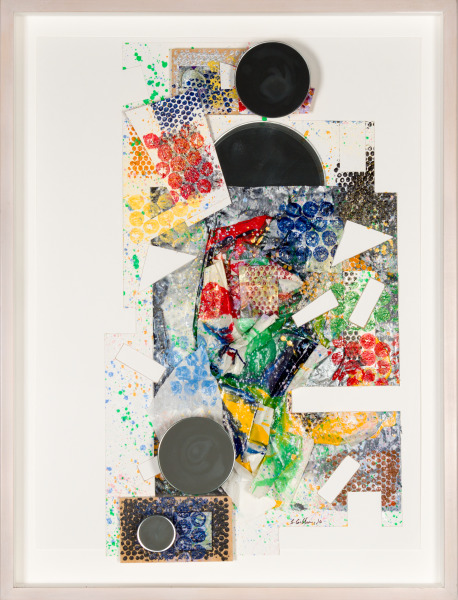 In this recent work, Gilliam has combined scraps of paper painted with vibrant colors and patterns in a more traditional collage–like approach, combining them an additional layer of mirrored elements. The smooth surfaces of the mirrors contrast with the different textures of the painted paper. They also reflect both the painted surfaces and the viewer, depending on the angle at which the work is seen. The title refers to the daughter of the artist Kevin Cole, whom Gilliam has mentored for many years. It was included in the exhibition Protégé at the Harvey B. Gantt Center for African–American Arts + Culture in 2010–11, which explored the relationship between the two artists’ work.