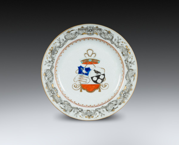 This plate was made for Thimon van Schoonhoven of Rotterdam. It is decorated with his arms and those of his wife, Elisabeth Geraerds of Haarlem. Van Schoonhoven was a director in the Dutch East India Company, the powerful firm established by the Dutch in 1602 to trade with Asia.