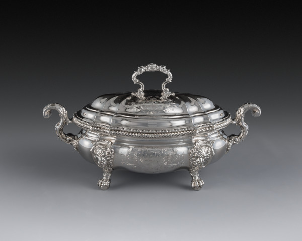Dinner services in silver and silver-gilt came into fashion early in the 18th century and were highly prized by Europe's rulers and aristocracy. Because of their scale and virtually limitless potential for ornamentation, tureens were the principal elements of the elegant dinner service and occupied prominent positions on the table, surrounded by other serving dishes and platters. These tureens were commissioned by two members of the Lamb family. Sir Matthew Lamb (1705–1768), ordered one of the large tureens in 1739 from George Wickes, a prominent London silversmith. Matthew was succeeded by his son, Peniston Lamb (1748–1828), 1st Viscount Melbourne in the Peerage of Ireland, who commissioned the other tureens—one in 1768, the other in 1774—from John Parker and Edward Wakelin. Parker and Wakelin had worked for Wickes and took over his business when Wickes retired in 1760. Note the finely engraved Lamb armorials on the tureens.